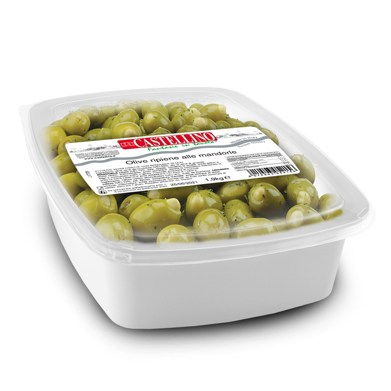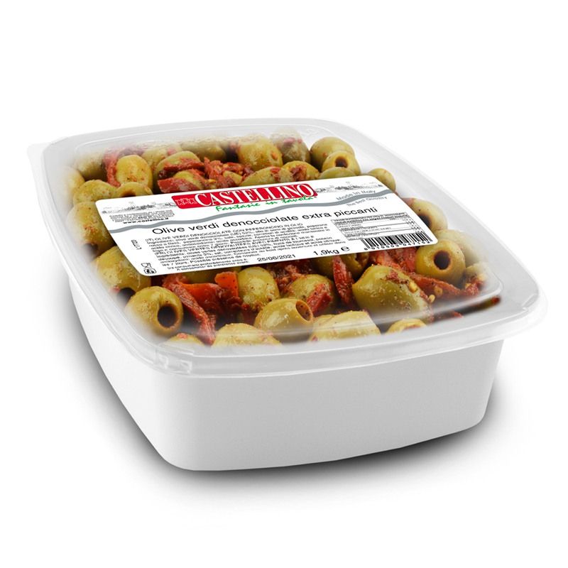 Olives vertes dénoyautées, huile de tournesol, filets de poivrons rouges, piment, sel, épices, correcteurs d'acidité acide lactique et acide citrique, antioxydant : acide ascorbique.