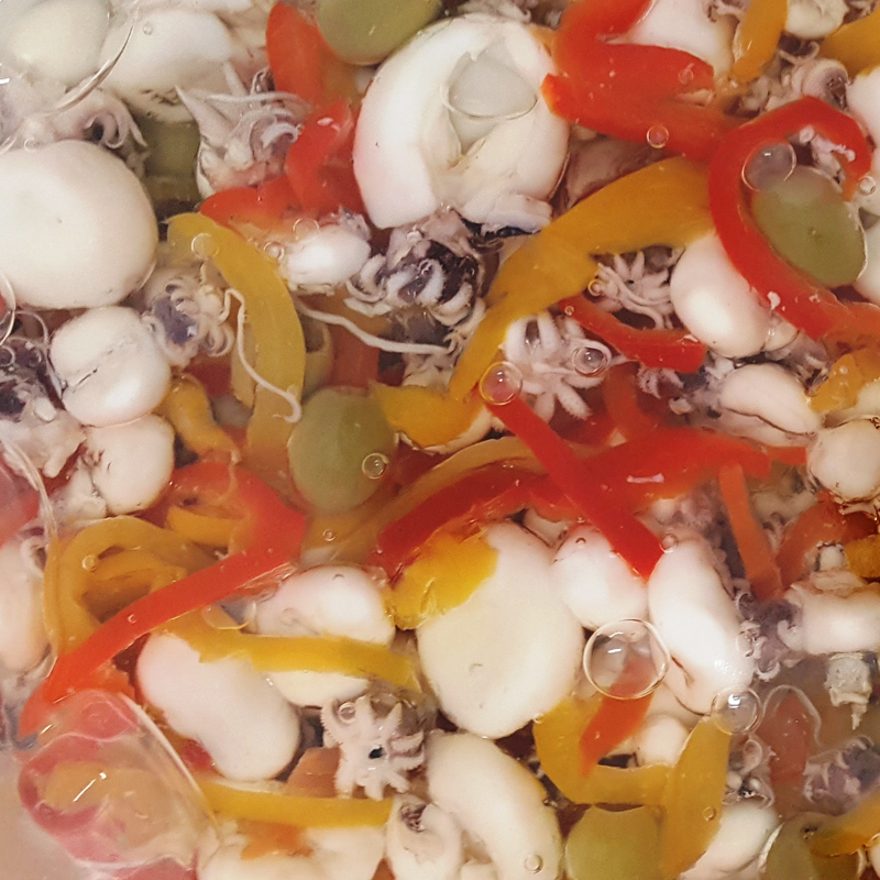 Ces petites seiches marinées à l'huile légèrement vinaigrée et agrémentées d’olives et de lamelles de poivron sont parfaites pour égayer une assiette d'antipasti ou pour agrémenter une salade de la mer. La marinade apporte une harmonie des saveurs et leur confère une texture fondante qui saura séduire les adeptes de ce petit céphalopode.