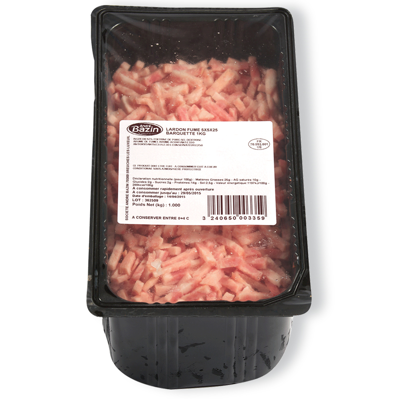 Les lardons fumés sont de petits morceaux de lard coupés en dés, souvent utilisés pour ajouter une saveur riche et fumée aux plats. Ils sont couramment utilisés comme ingrédient dans les salades, les quiches, les pâtes, les soupes, et bien d'autres recettes, pour leur ajouter une note savoureuse et salée. Leur polyvalence en fait un ingrédient populaire en cuisine, d'autant qu'il est très apprécié pour son goût caractéristique et sa capacité à rehausser le goût des plats.